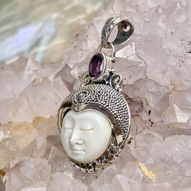 Prev Next Beautiful Balinese handmade 925 silver bone face Pendants with hand carving buffalo bone and Amethyst 24 USD x 1pcs Gemstone : Amethyst Dimension : 41 X 22 mm Weight : 8.80 gr Availability: Out of stock