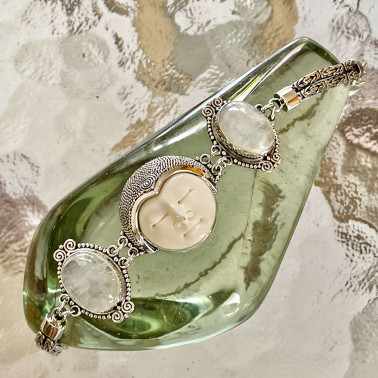 Beautiful Balinese handmade 925 silver bone face bracelet with hand carving buffalo bone and rainbow moonstone.