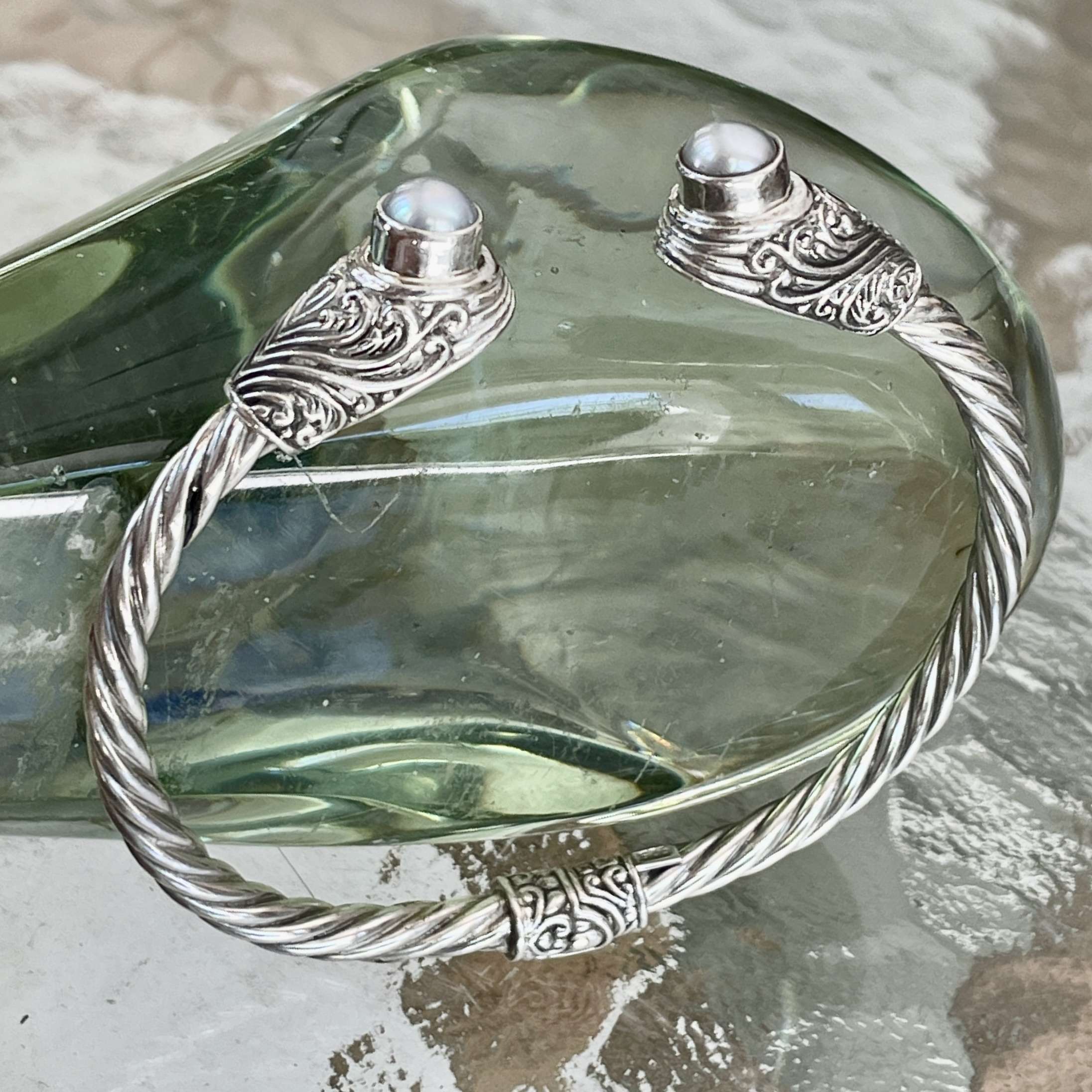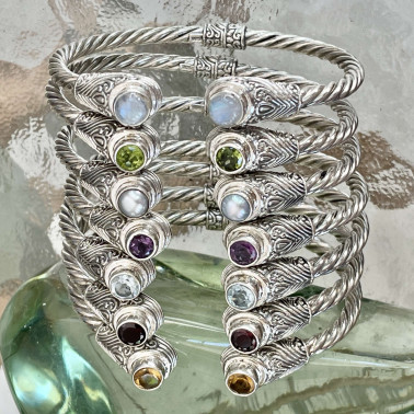 Handmade 925 Bali Sterling Silver Hinge Cuff Bracelets With PEARL. The widest inner size is 60 mm. This bracelet has hinges for easy wearing. Also available with CITRINE, BLUE TOPAZ, GARNET, AMETHYST, PERIDOT, RAINBOW MOONSTONE