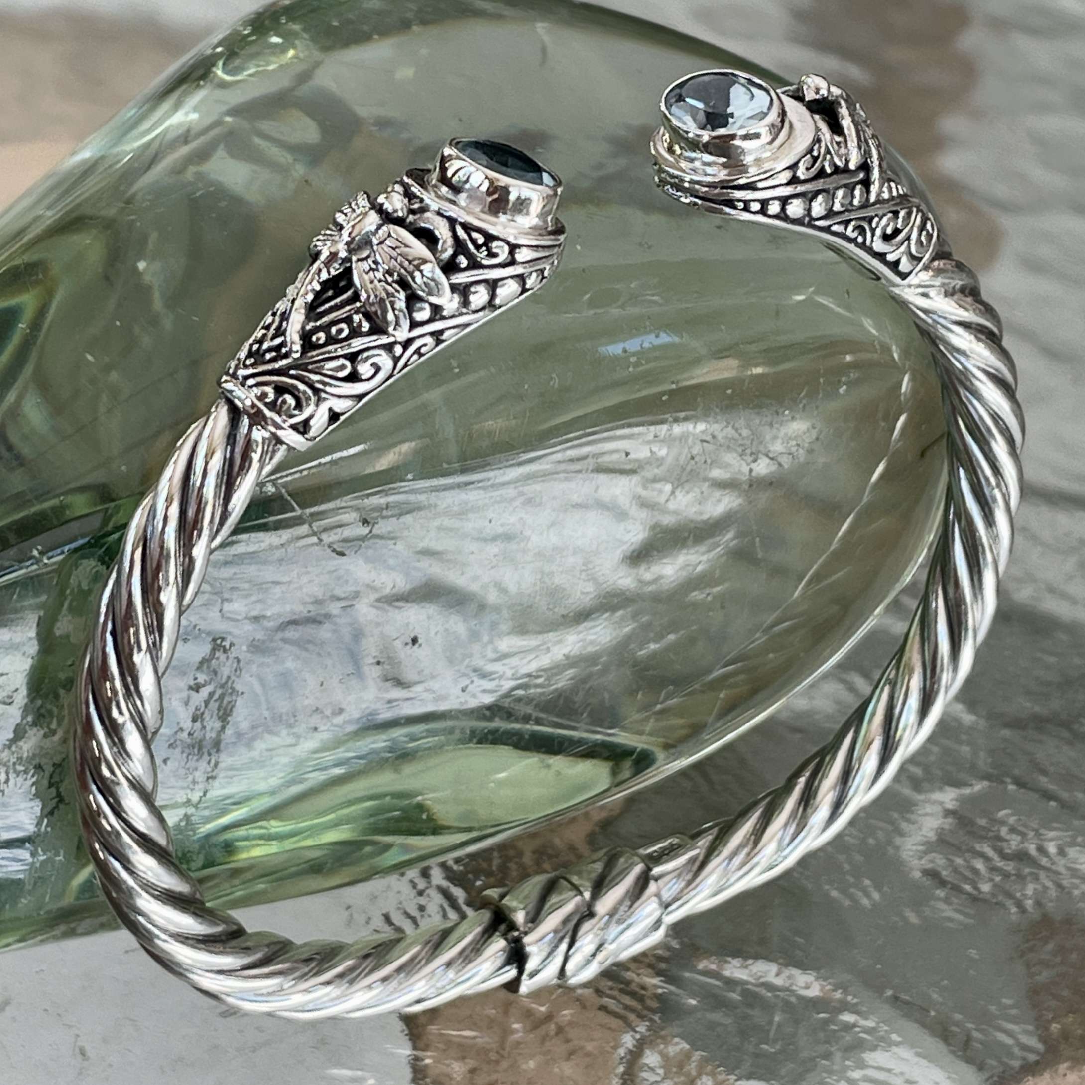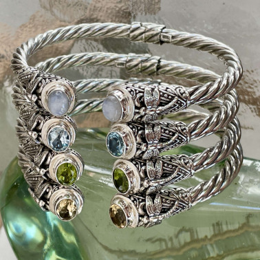 Handmade 925 Bali Sterling Silver Hinge Cuff Bracelets With BLUE TOPAZ. The widest inner size is 65 mm. This bracelet has hinges for easy wearing. Also available with CITRINE, RAINBOW MOONSTONE, PERIDOT