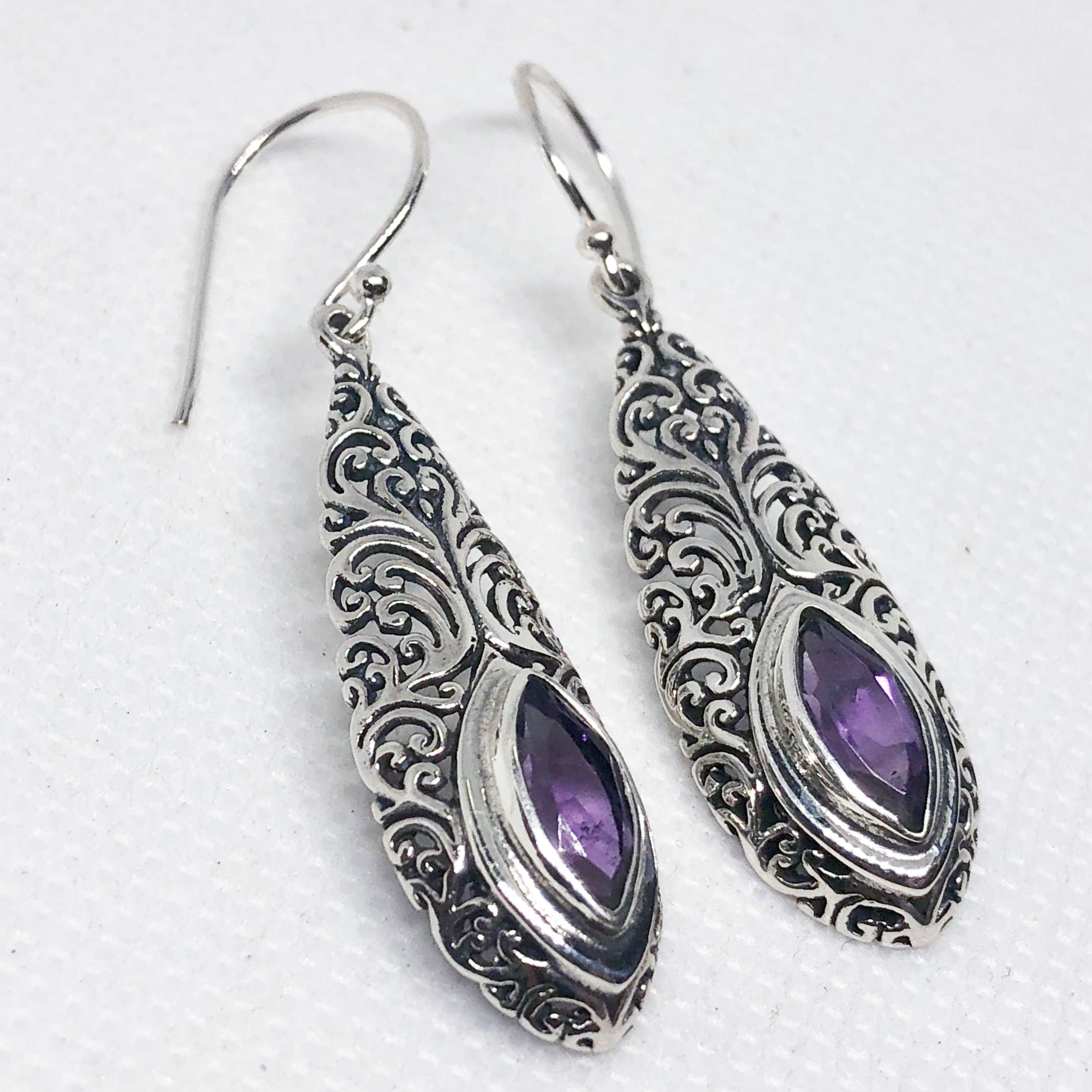 ER 14488 AM-(UNIQUE 925 BALI SILVER FILIGREE EARRINGS WITH AMETHYST)