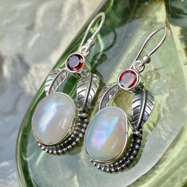 Handmade 925 Bali Sterling Silver Earrings with Biwa Shell, Garnet