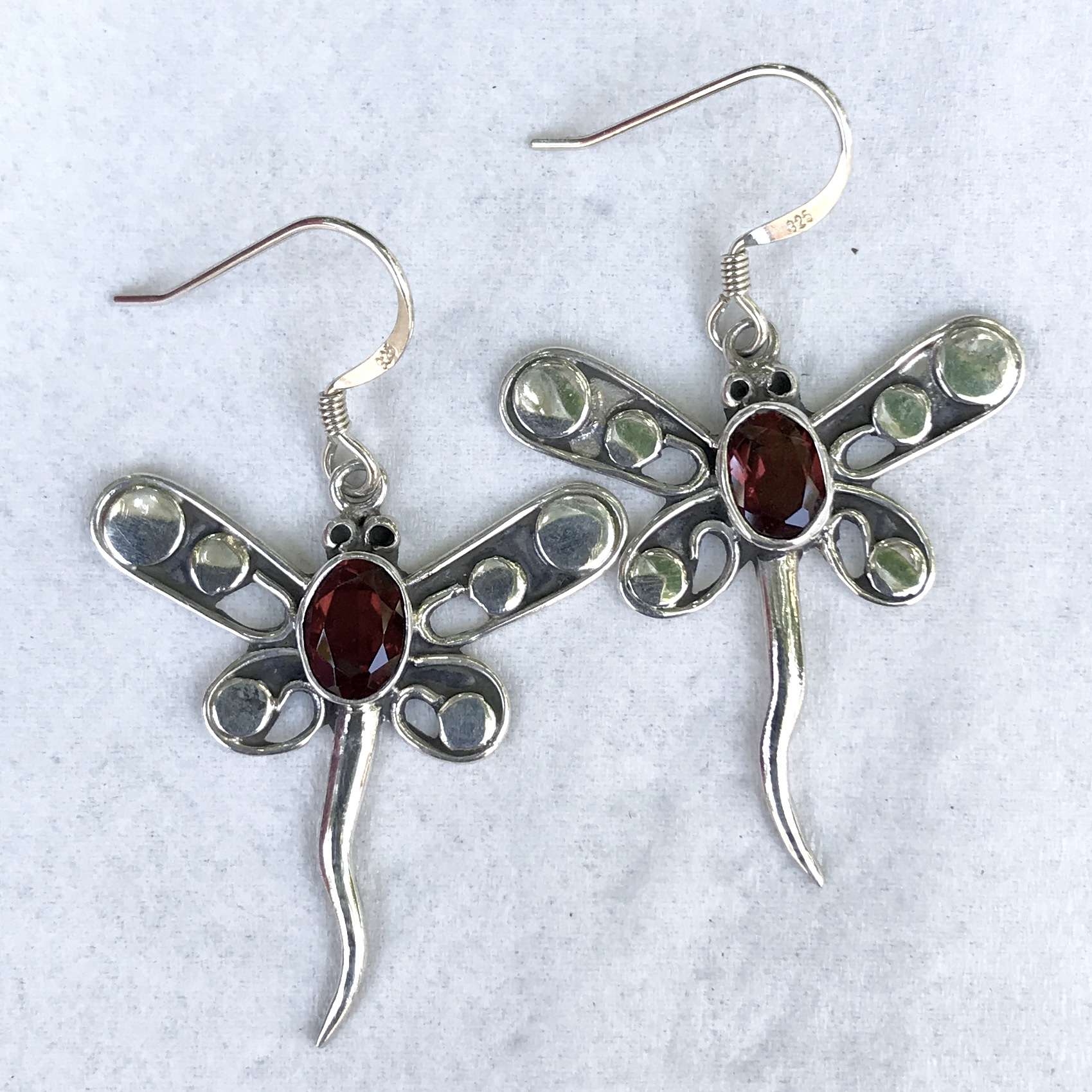 Handmade 925 Bali Silver Dragonfly Earrings with GARNET