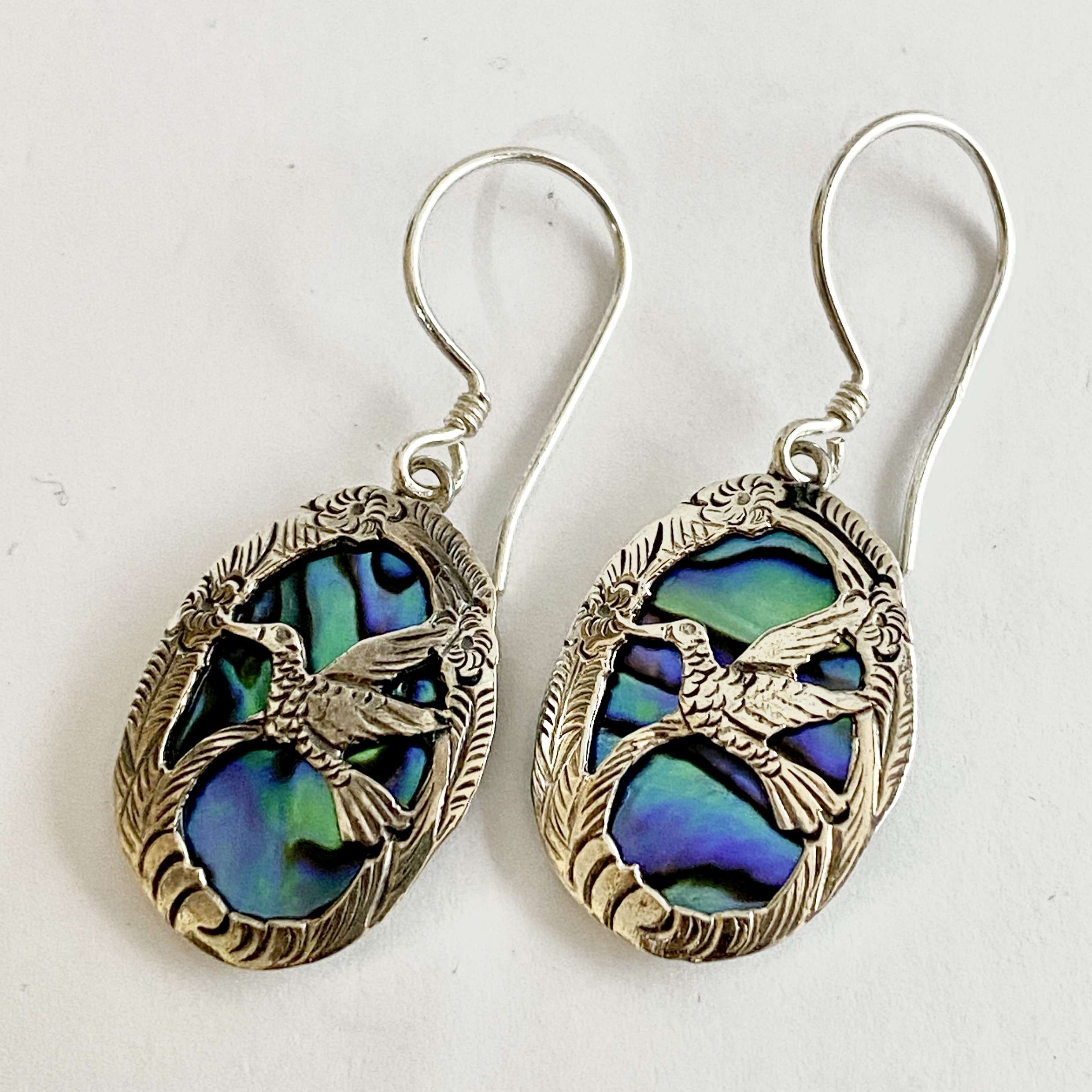 Beautiful Balinese 925 Silver Bird Earrings with ABALONE and CORAL and MOP.