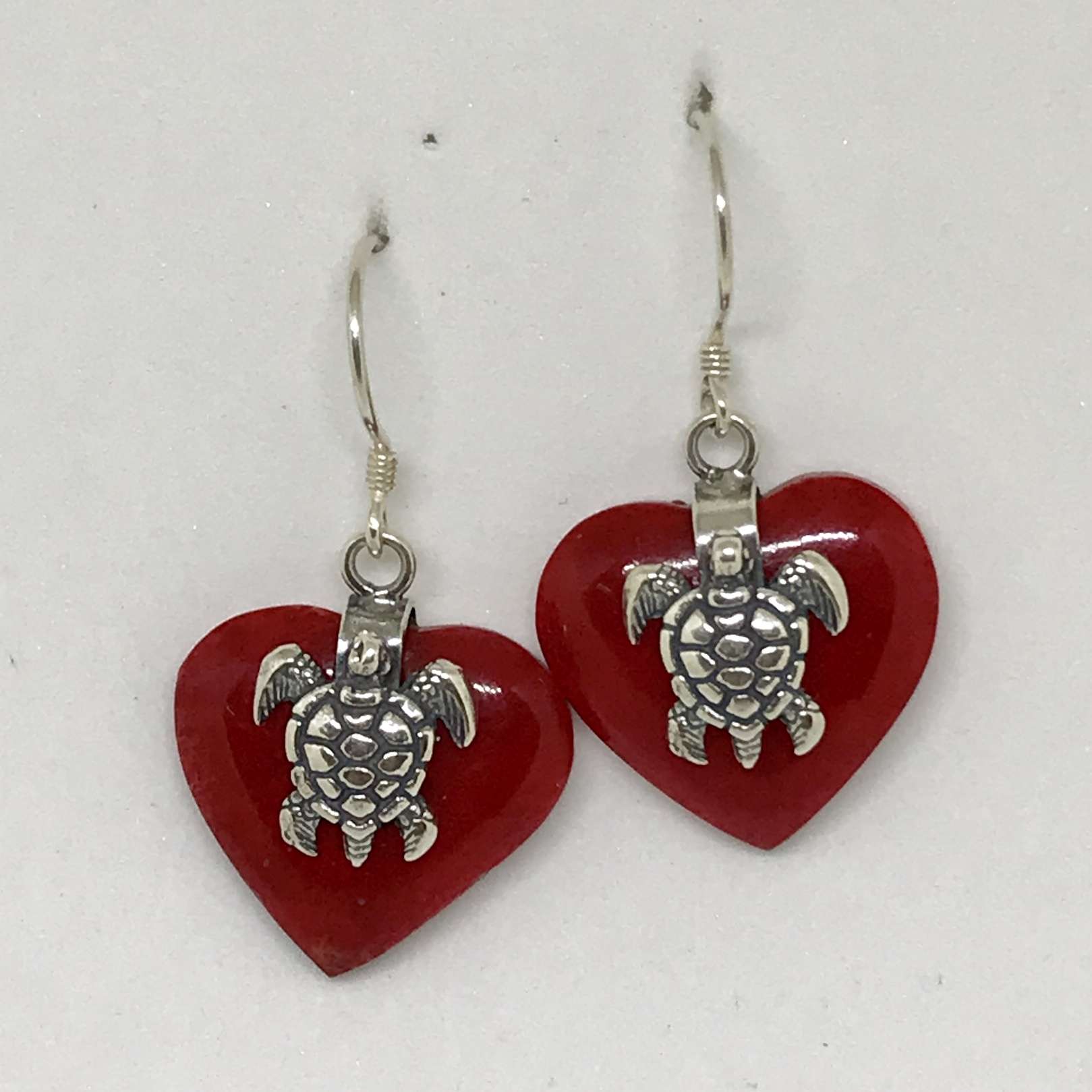 925 Bali Silver Turtle Heart Earrings with red coral