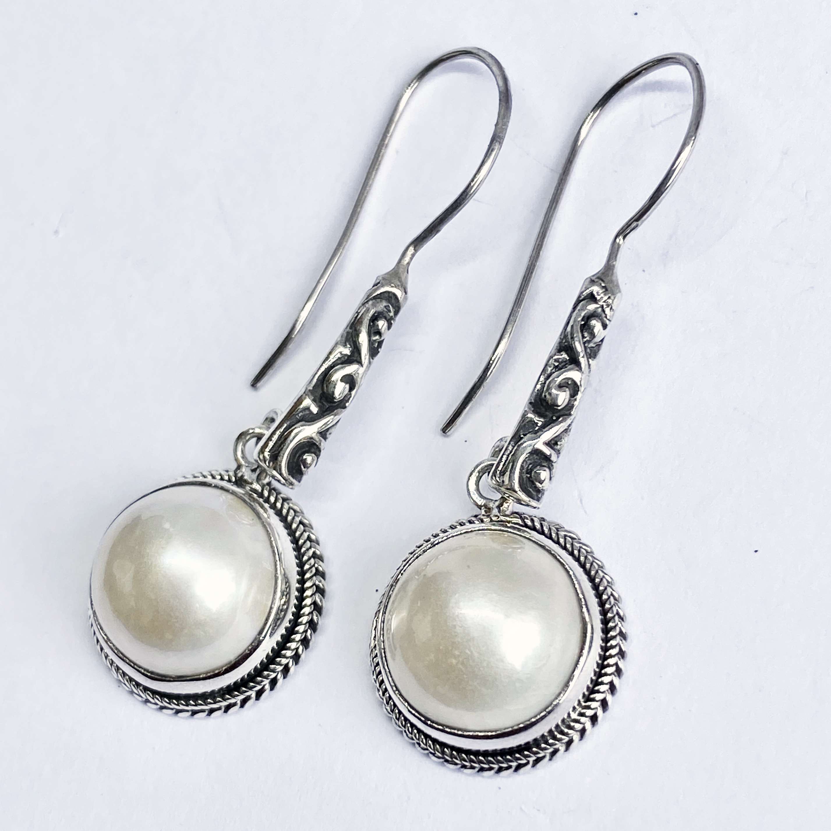 Beautiful Balinese Handmade 925 Silver Filigree Earrings with WHITE MABE PEARL.